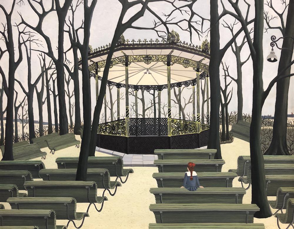 Conservé dans les réserves du Musée L, Le kiosque en hiver (1966) est l’un des tableaux les plus sensibles de Micheline Boyadjian, artiste bruxelloise souvent rangée dans l’art naïf, une étiquette qu’elle n’aimait pas. On observe peu d’éléments sur le tableau, mais une atmosphère puissante s'en dégage : ciel blanc, arbres nus, solitude douce. Comme toujours chez Boyadjian, la simplicité apparente ouvre un espace de rêverie.