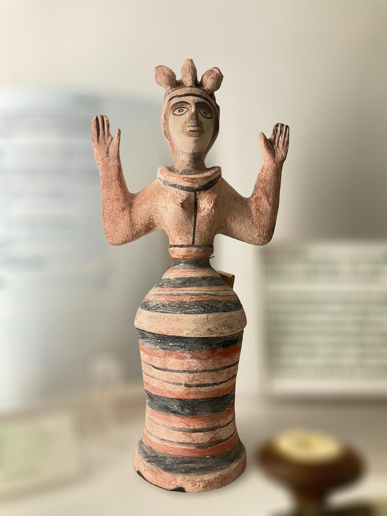 Ces figurines ont été découvertes dans des sanctuaires communautaires de la Crète post-palatiale et sont interprétées comme des représentations de déesses.