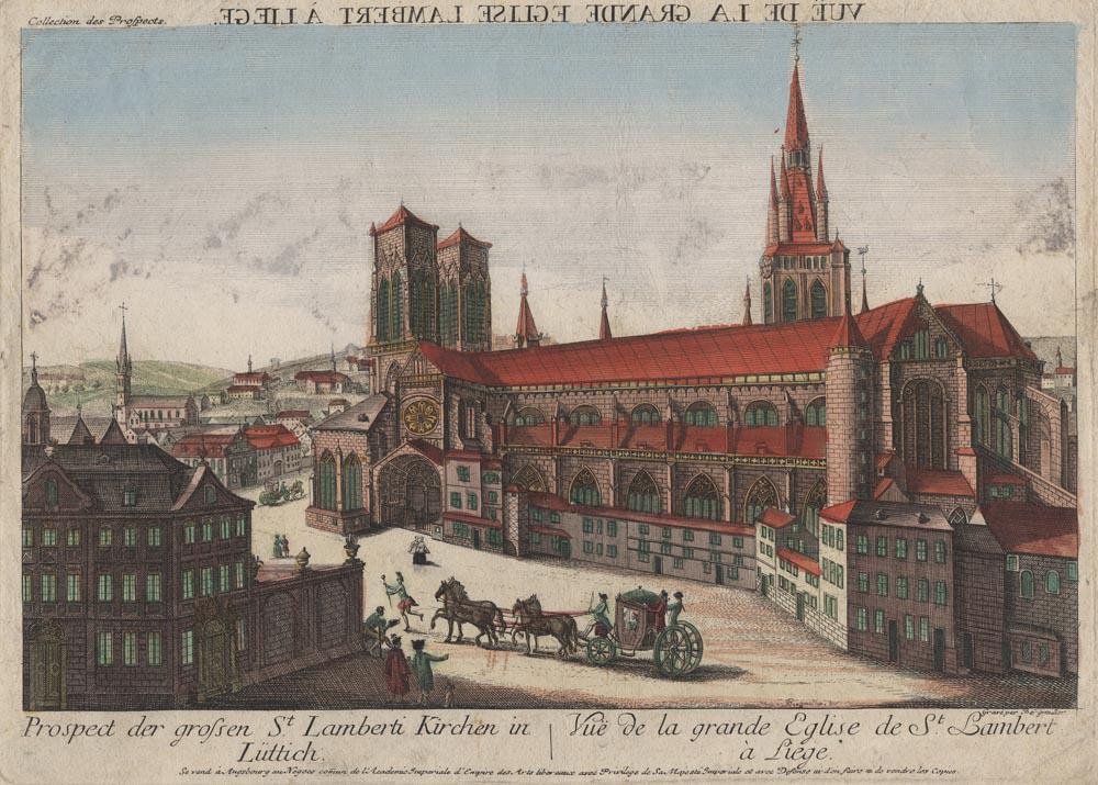 Gravure à l'eau-forte aquarelllée - Vue de la grande église de Saint-Lambert à Liège par Johann Baptist Bergmülle © Musée Wittert ULiège