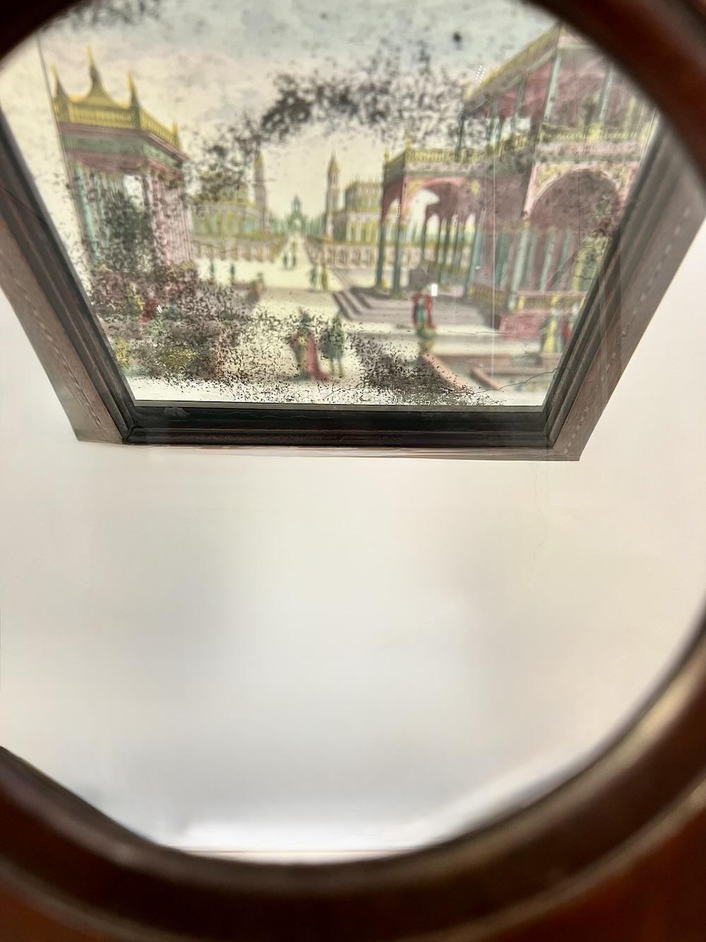 Cet appareil d’optique permettait aux « spectateurs » de vivre une sorte d’expérience immersive. Les représentations de lieux exotiques et d’architecture de monuments remarquables rencontraient beaucoup de succès.