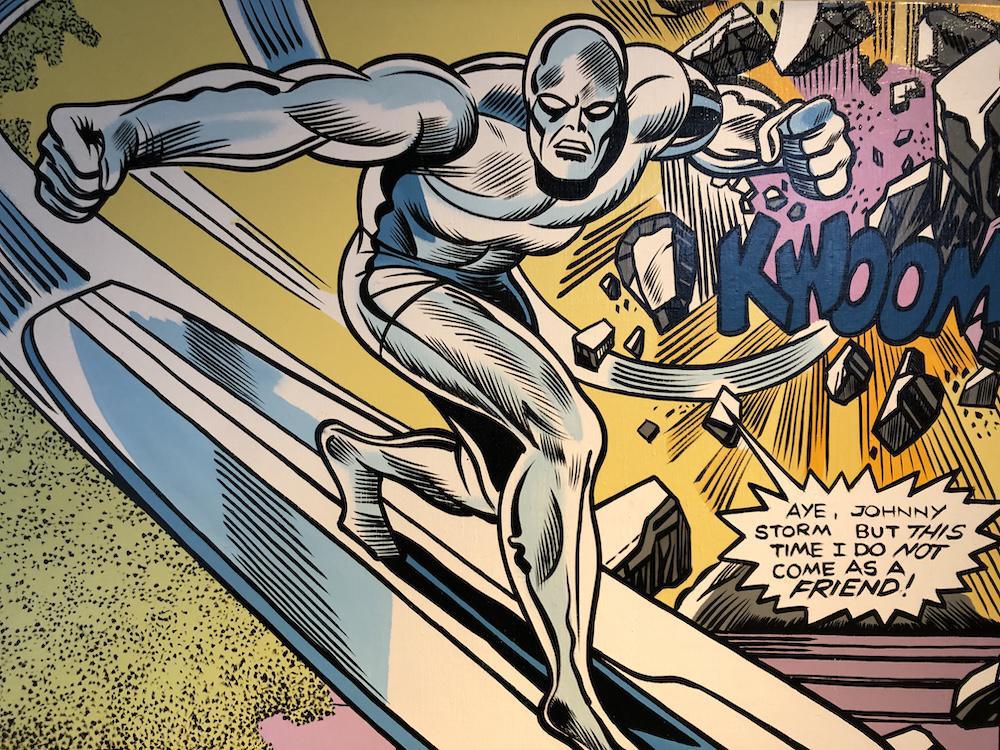 The Silver surfer illustre la technique la plus utilisée par Erró : une image de culture populaire associée à une œuvre majeure de l’art moderne. Son but : provoquer un choc visuel. Pour l’artiste il n’y a pas de hiérarchie entre les styles culturels.